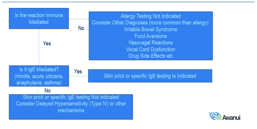 • For foods, allergy testing should only be performed in those with a history of an acute IgE mediated reaction who is currently avoiding the food in question.